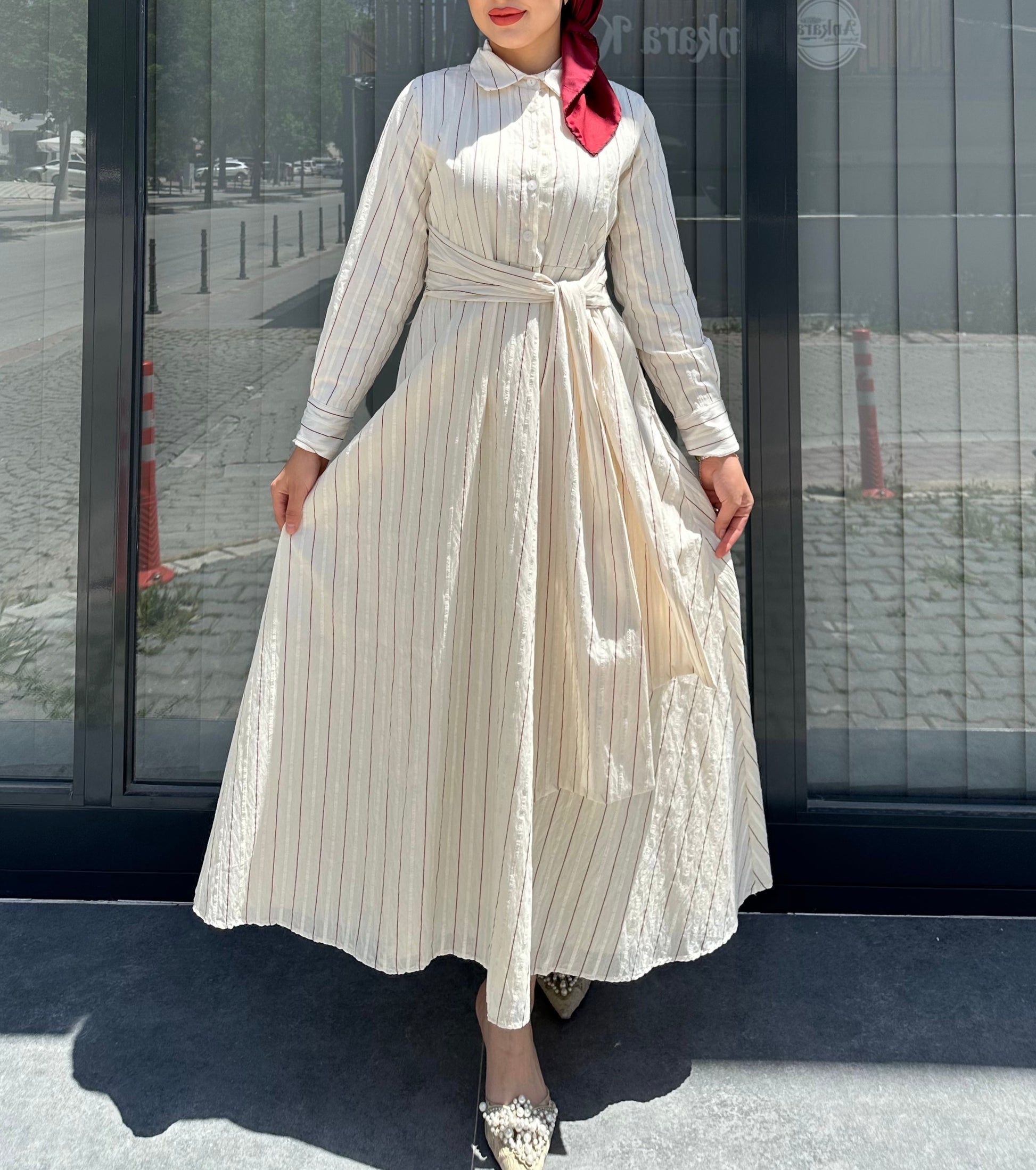 KREM BORDO ÇİZGİLİ BELİ KUŞAKLI ELBİSE