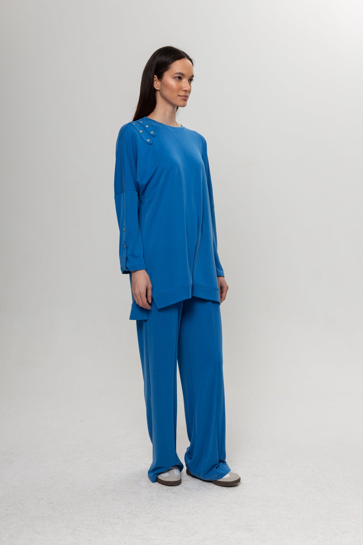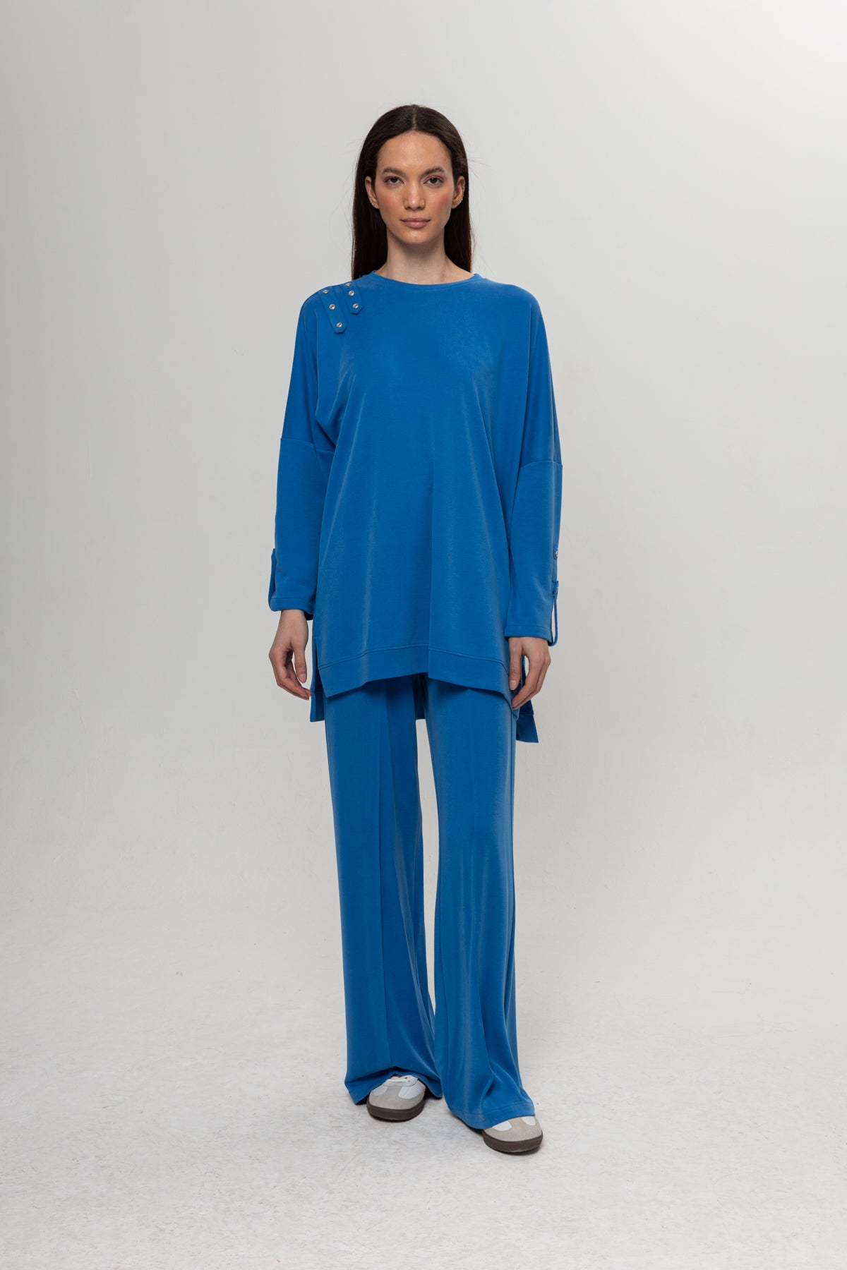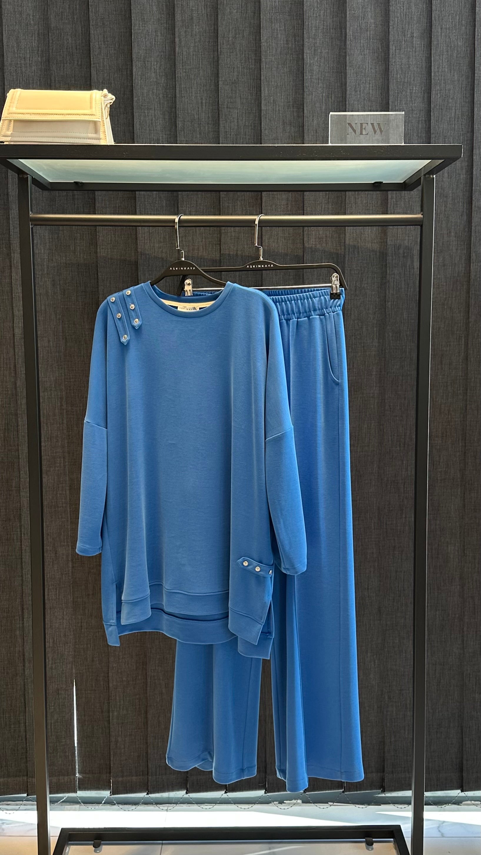 MAVİ OMUZLARI DÜĞME DETAYLI İKİLİ TAKIM