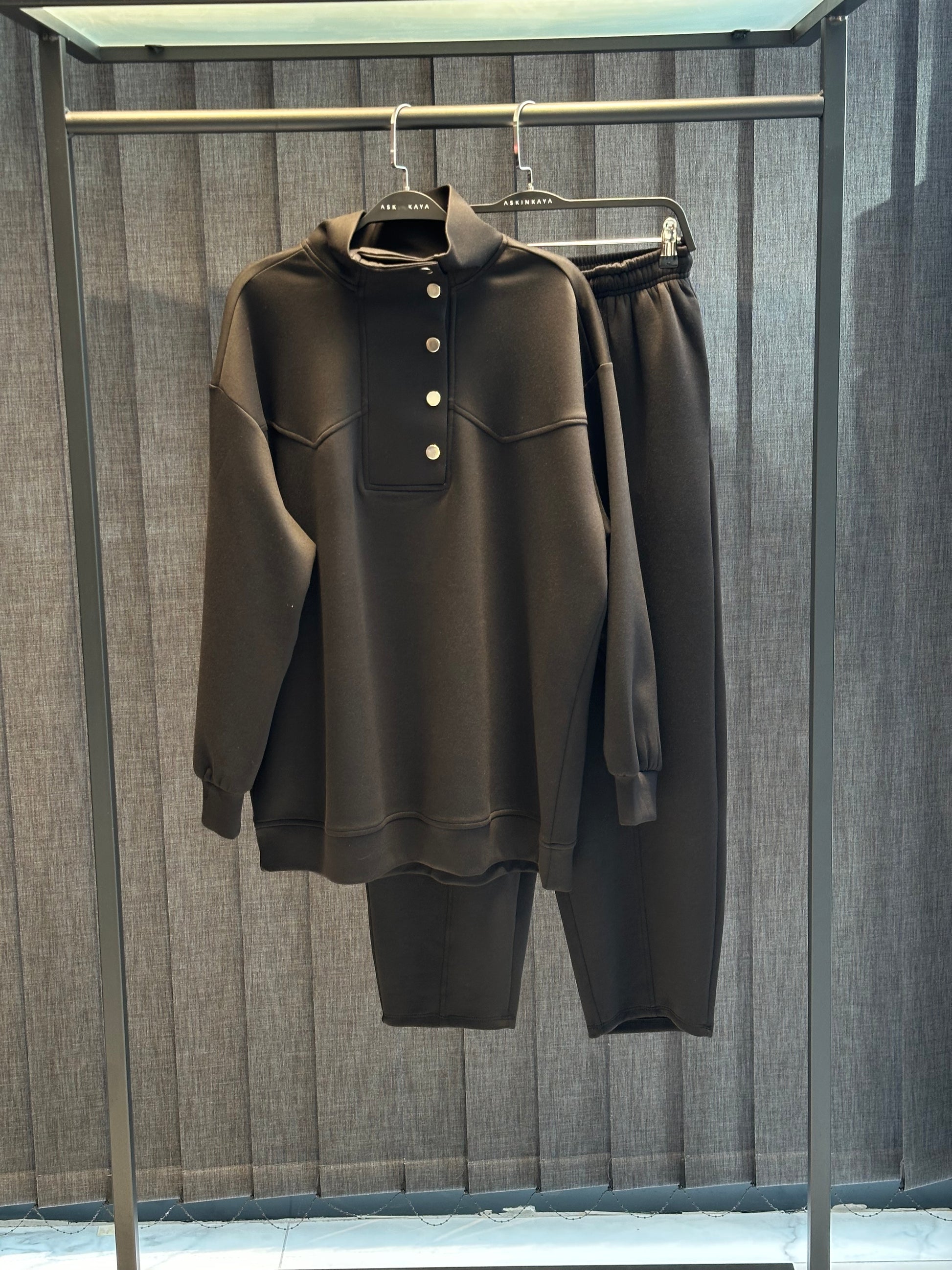 SİYAH ÇITÇITLI YÜKSEK YAKA VE KESİK DETAYLI PANTOLON TAKIM