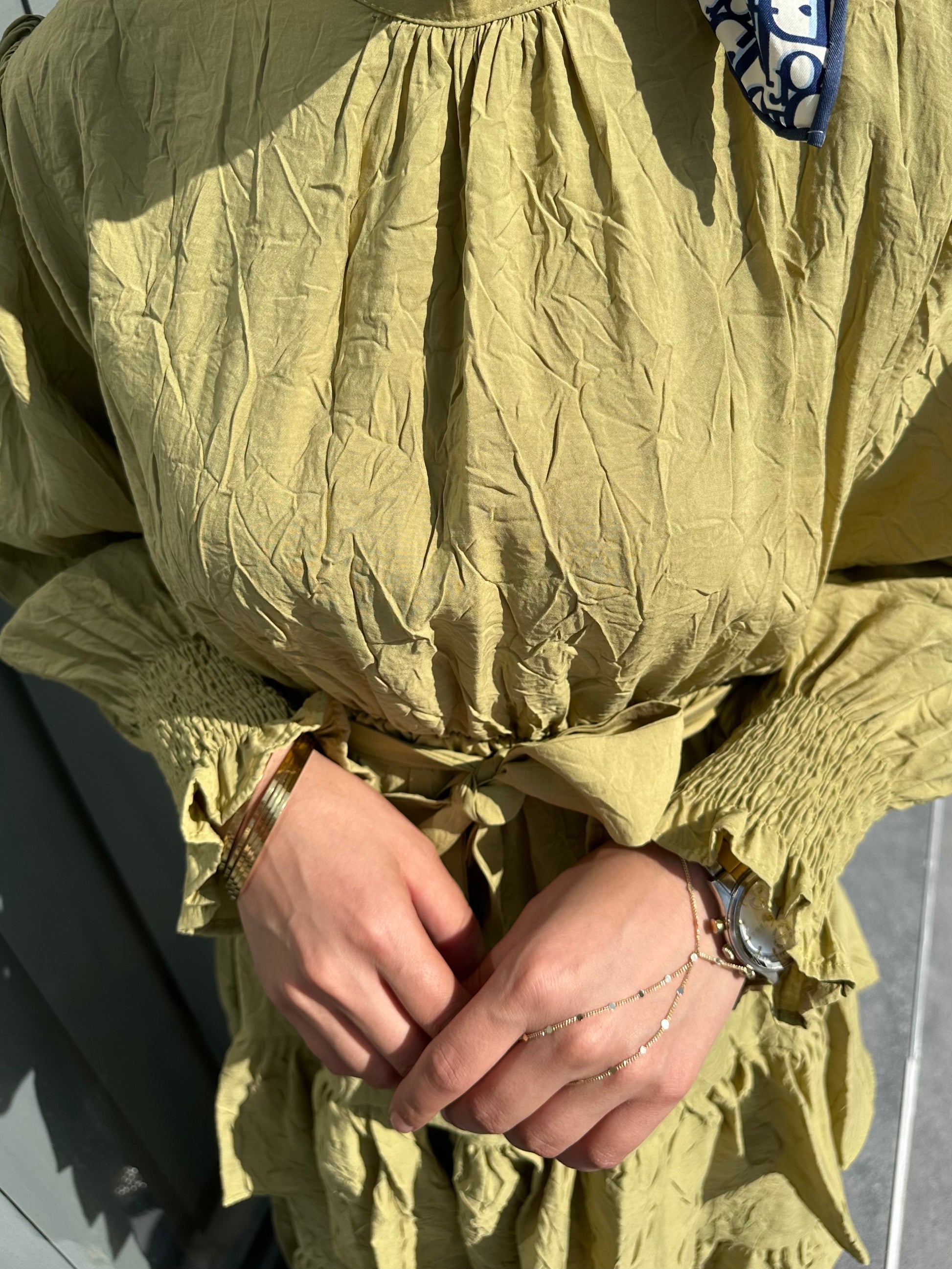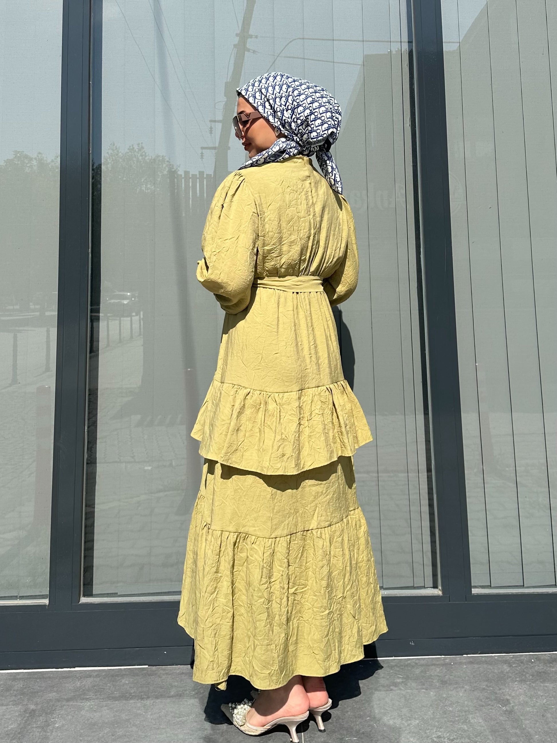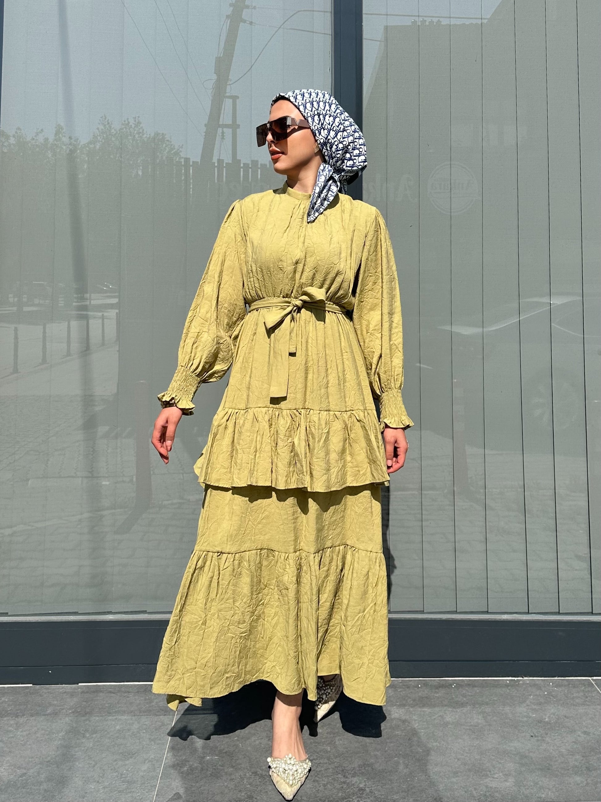 YAĞ YEŞİLİ BELİ LASTİKLİ KUŞAKLI ELBİSE