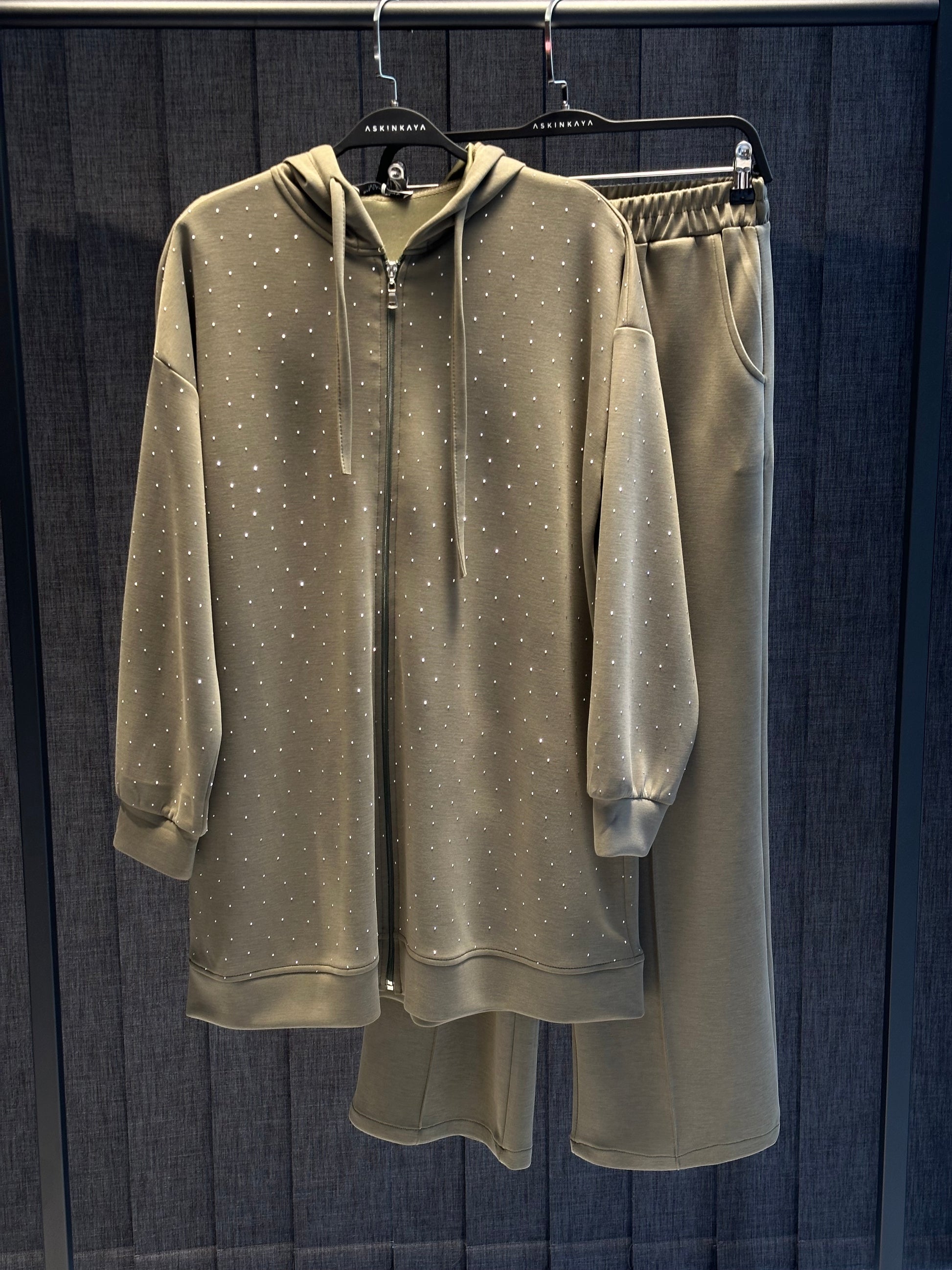 YEŞİL ÖNÜ TAŞLI FERMUAR DETAYLI PANTOLON TAKIM